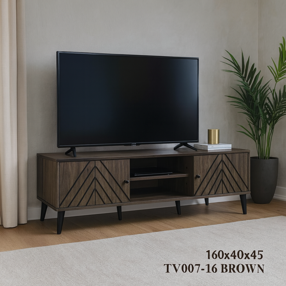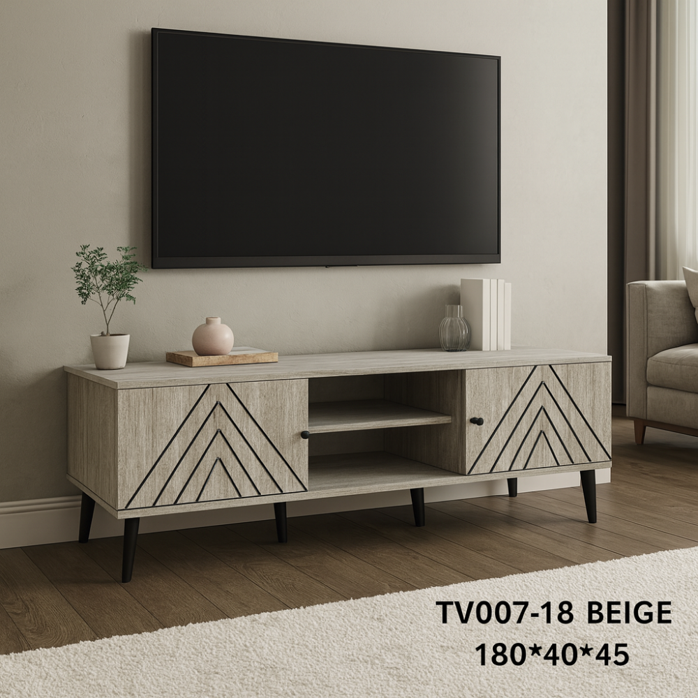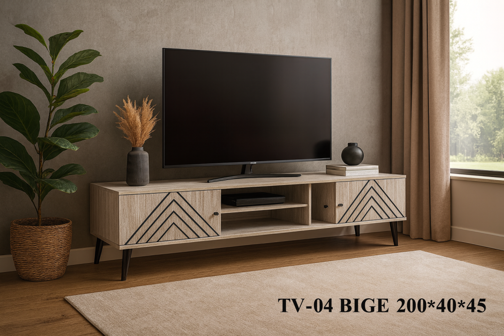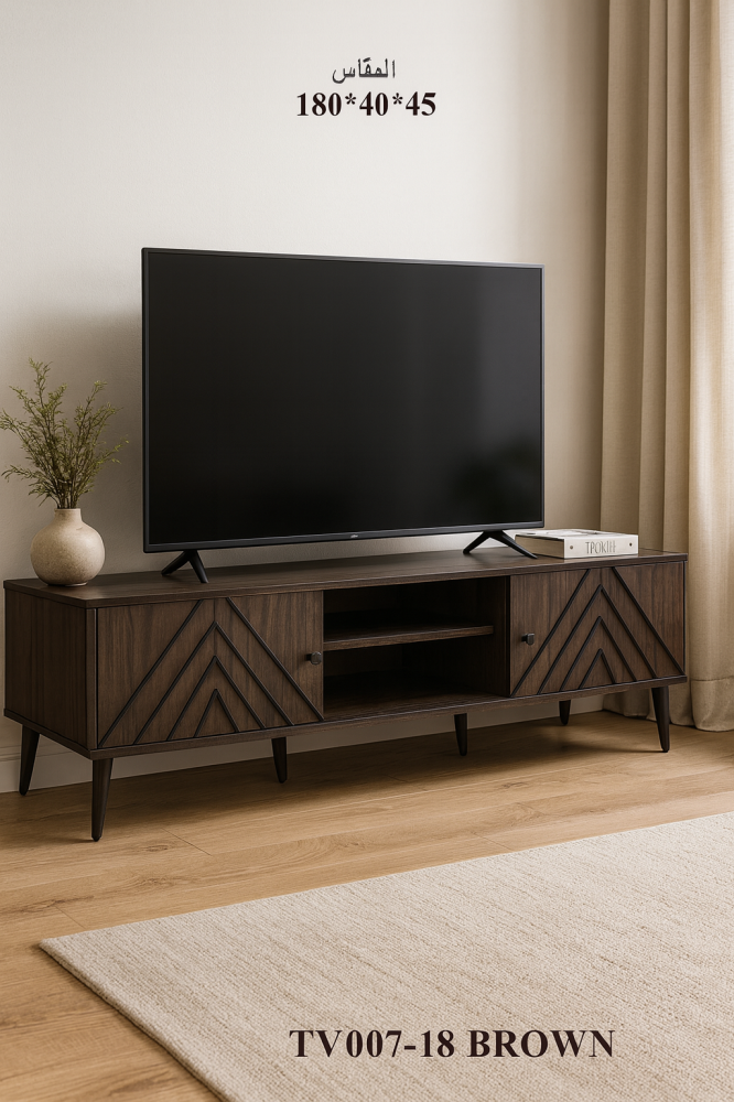 طاولة تلفزيون خشب بتصميم أنيق وعصري تضيف لمسة جمالية وتنظيم مثالي لغرفة المعيشة أو الصالات الواسعة. مصنوعة من خشب عالي الجودة يجمع بين المتانة والفخامة مع سطح علوي واسع يناسب الشاشات الكبيرة والديكورات الجانبية مثل المزهريات والكتب والإكسسوارات.